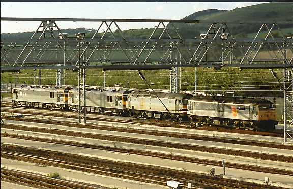 Two 47s and two 92s wait at Dollands Moor yard for a return trip to London.