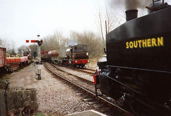 USA 65 waits while a freight enters the passing loop at Wittersham Road station