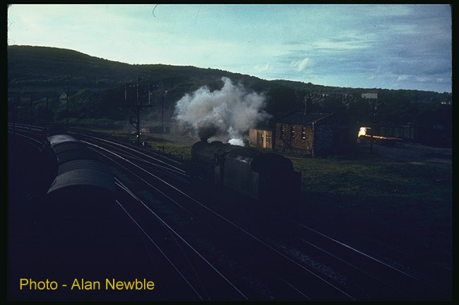 Seen from the footbridge from the road to the Shed, this "Black 5" drifts down the mainline towards the station at Carnforth, coming off the Barrow line.