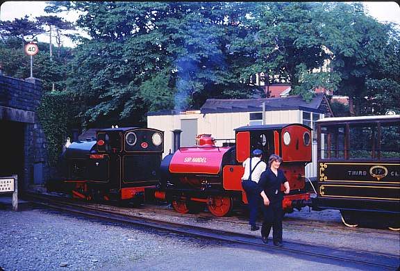 Loco. No.4 and No.3 (temporarily known as "Sir Handel") prepare to take a monster train out of Wharf Station for a special event. Fireman Liz Green goes for the tea while driver (Phil Guest?) does the last-minute checks. (Sandwiches etc.)