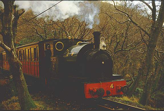 Loco. 4 still in GWR livery, ambles briskly up the grade from Dolgoch towards Quarry Siding where there is a halt and a Blockpost, plus a siding and a loop for crossings. It can be dim in these woods... at least, that's my excuse!