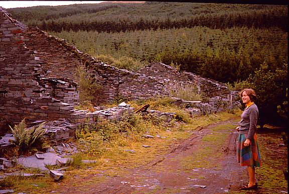 Here you see what remained of the old slate mine in about 1977. Jane, my wife, is looking at the old dressiing shops, and one place still, then, called "cafe" Since then, forestry has taken over the whole site, and this photo cannot be taken.
