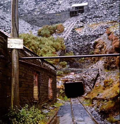 What a lovely picture of an old slate mine, complete with a view of old inclined planes which used to lower produce from the upper levels down to the "shops" for conversion to useful roofing slates, gravestones or whatever. One wagon went up as the other came down, thus conserving energy. This mine at Aberllefenni was still working in the late 70s when this photo was taken. The Talyllyn was built for just such a purpose, and is not far away - in fact there were at one time proposals for linking the Corris Railway to the Talyllyn.
